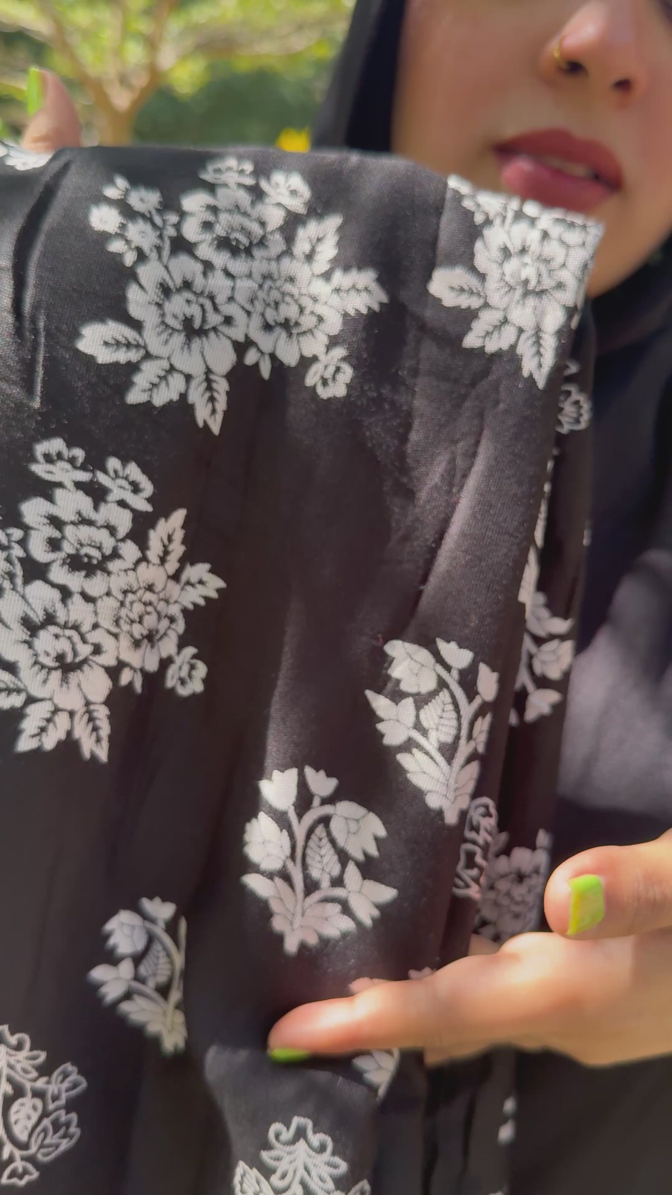 • Top: Black printed rayon with delicate floral booti pattern all over
